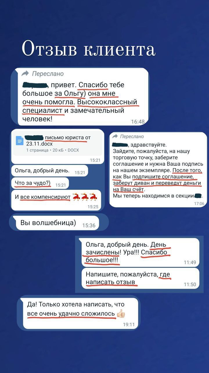 Составление претензий, исковых заявлений в суд о защите прав потребителей, соглашений о возмещении расходов потребителей, представление интересов потребителей в судах (возврат некачественного товара/не оказали услуги, возмещение ущерба, возврат денег за товар/услугу, нарушение гарантийных обязательств продавцом, нарушение сроков передачи товара и т.д.)